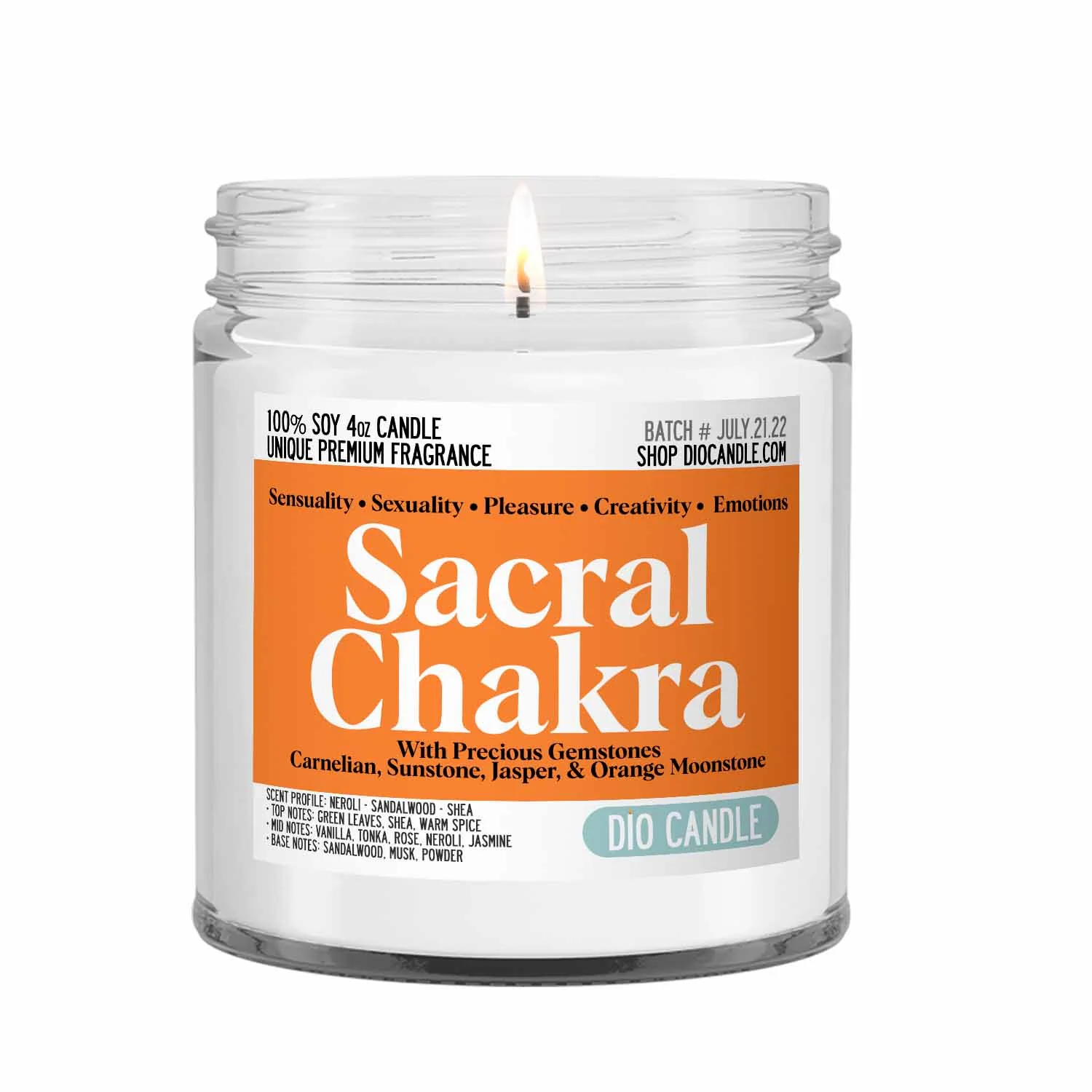 Inspire spiritual balance and creativity with this scented soy wax candle infused with moon-charged gemstones to cleanse and balance the sacral chakra. Crafted with intention and care, this candle brings peace and a sense of joy to the home.