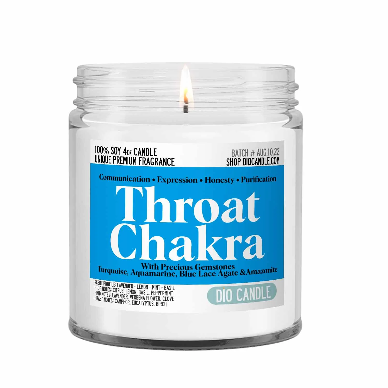 Experience spiritual cleansing and relaxation with Throat Chakra Crystal Candle, crafted with scented soy wax and moon-charged throat chakra gemstones. Highly fragrant, the candle provides an ambient, peaceful atmosphere made with intention. Transform any environment with this beautiful and aromatic candle.
